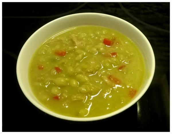 Liota herneitä litrassa vettä yön yli. Pane herneet liotusvedessään kiehumaan. Lisää vettä ja possunliha joukkoon. Anna kypsyä miedolla lämmöllä noin 1,5 tuntia. Kypsymisen loppuvaiheessa lisää paprikapalat joukkoon. Tarkista sakeus lisää nestettä tarvittaessa. Mausta lopuksi suolalla ja meiramilla.